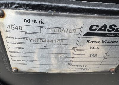 2017 Case IH 4540 Floater, diesel engine, Allison automatic transmission, Case IH 810 Flex Air, 70′ stainless steel boom, micro ingredient bins, Raven Viper IV controller, Smartrax AutoSteer. rear poly liquid impregnation tanks, cab heat/air conditioning, 750/45R26.5 front tires, 1000/50R25 rear tires, 4,590 hours.